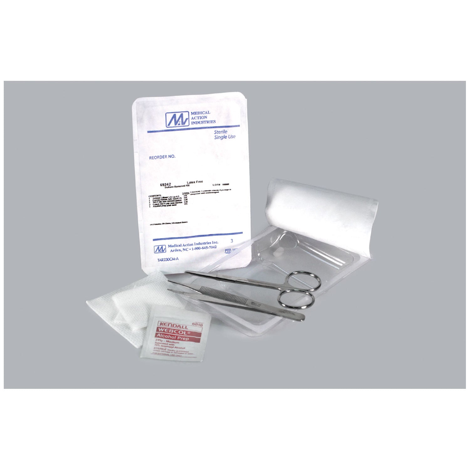 MEDICAL ACTION SUTURE REMOVAL KITS Suture Removal Kit Includes: (1) Forceps (Adson SS 4¾"), (1) Scissor (Littauer SS 4½"), (1) 3" x 3" 4-Ply NW Gauze, (1) Alcohol Prep, 50 kit/cs